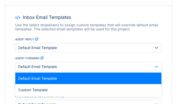 Assigning a Custom template to one of the Inbox Email Templates dropdowns will override the Default template for that inbox only. Emails sent from the Project with that inbox assigned will use the Custom template instead of the Default, but other Projects and inboxes will continue to use the Default template.