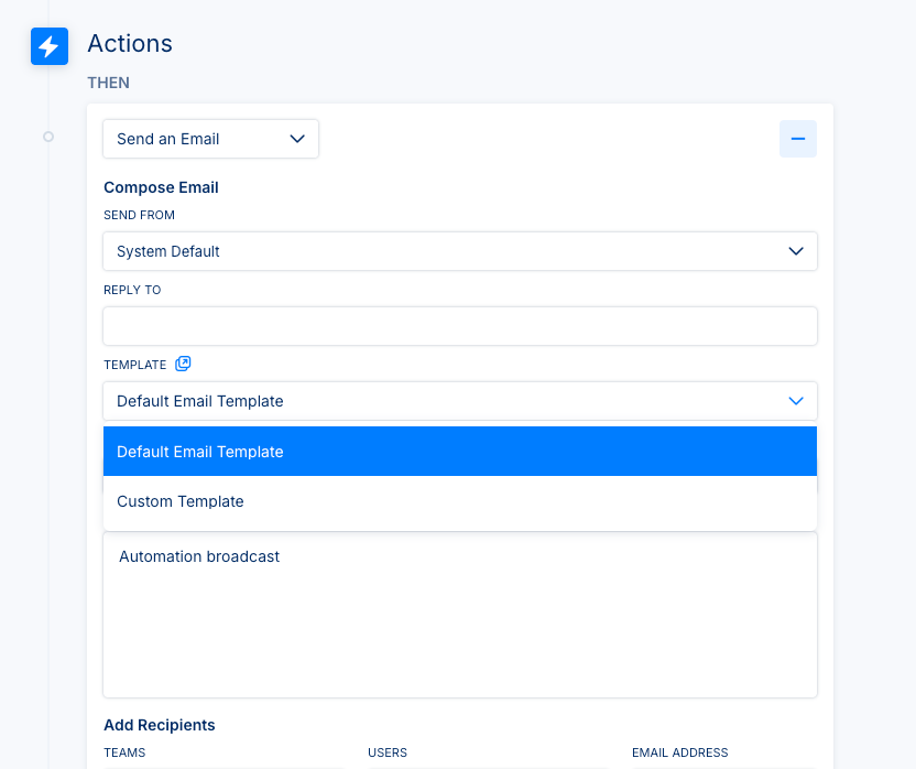 Unlike Helpdesk email template overrides which are controlled via a settings page, Broadcast template overrides are set on each individual Broadcast. Use the dropdown to select the desired template to use with the Broadcast step.