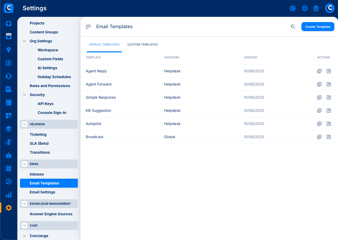 The “Email Templates” settings page can be found under the “Email” section of the “Settings” page. The page consists of the Default Templates tab and Custom Templates tab. Selecting a row will let the user Copy, Edit, or for Custom Templates Delete the selected template.