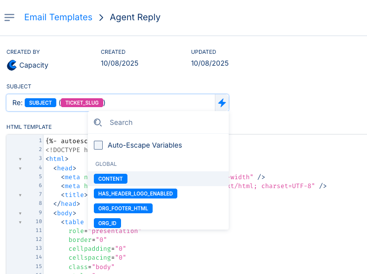 For example, an “Agent Reply” template email sent from the Helpdesk has access to variables like “reporter_name” and “ticket_reference_number”. When the Agent Reply email is sent, those variables referenced in the HTML code will be populated with information from the ticket.