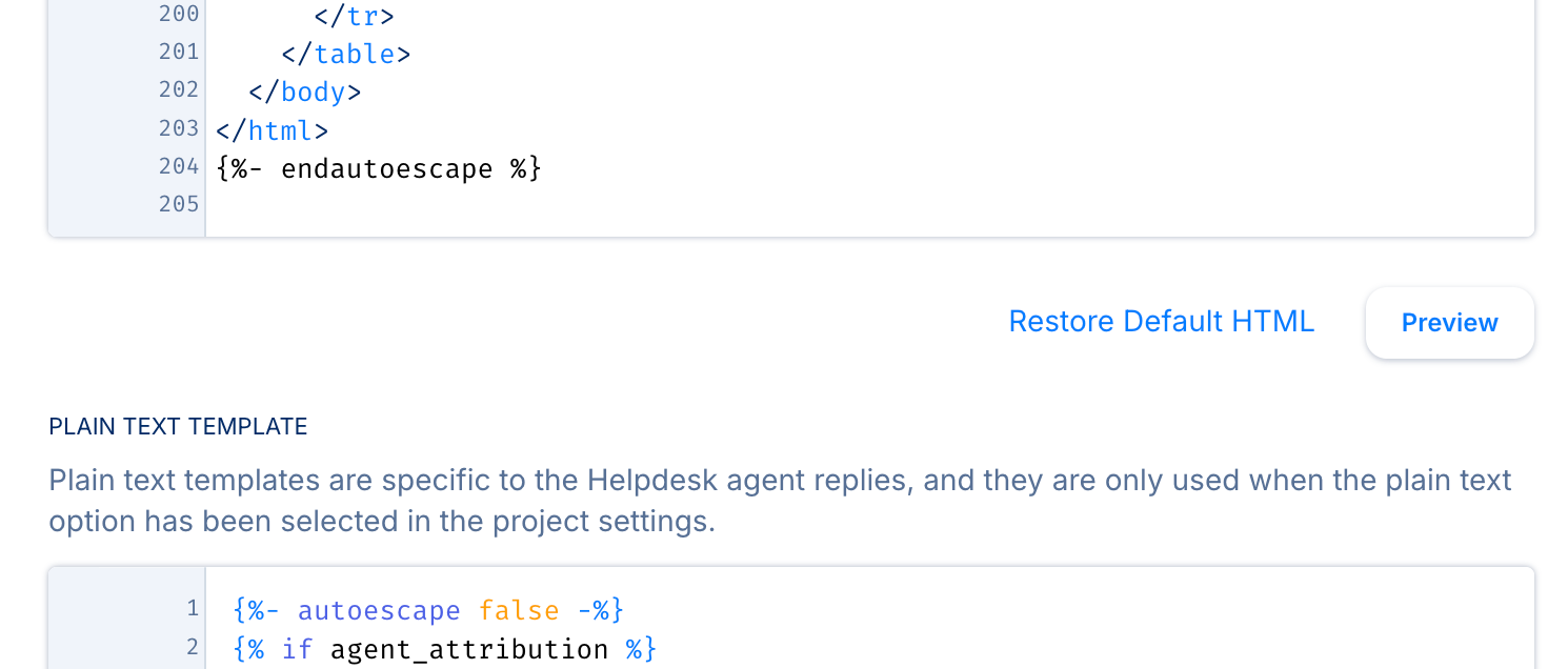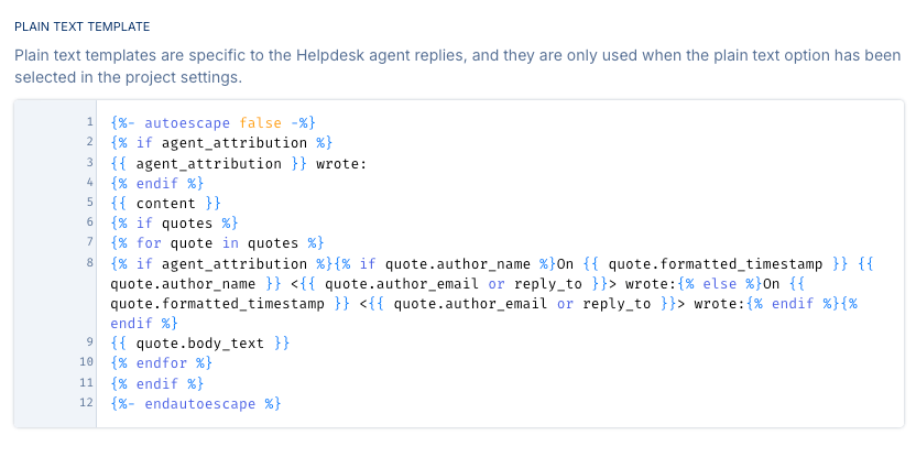 Users also have access to “variables” such as the content of an agent reply, an organization logo, or a project signature. Templates also have access to advanced “templating language” which allows for “conditional statements” and “for loops”. If some of these sound advanced or confusing, don’t worry, you can learn more about how to edit email templates in the article “How to edit Email Templates”.