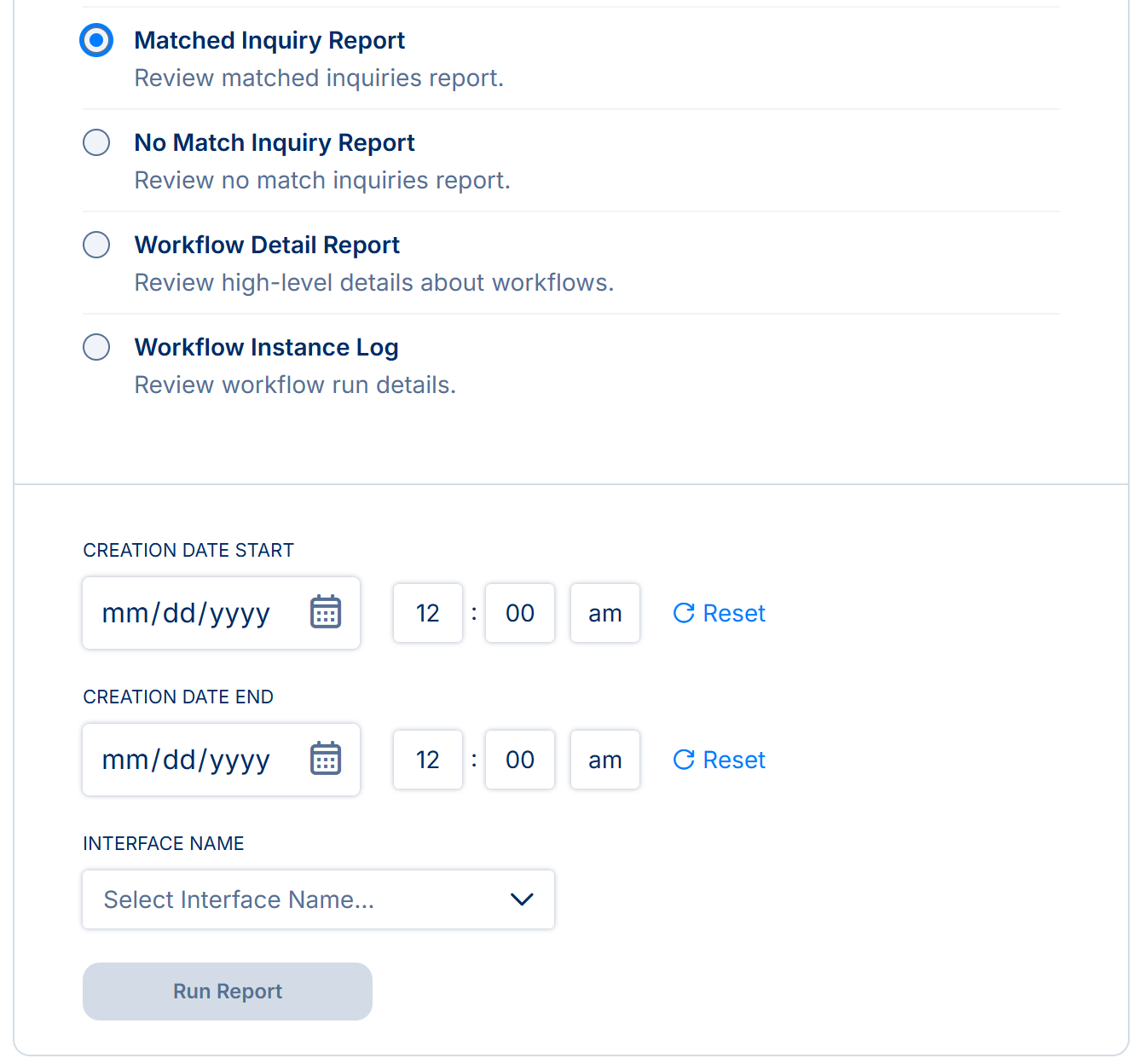 Select the Matched Inquiry report from the list and specify your filters to run the report. The available filters include: