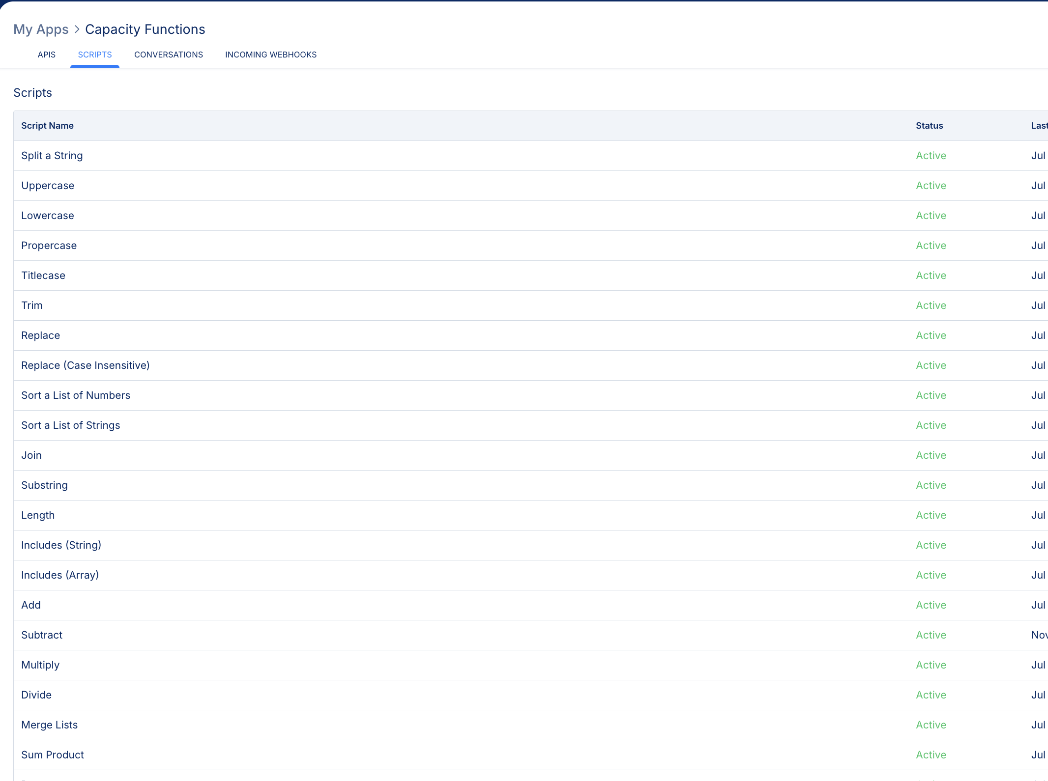 The main dashboard (My Apps > Capacity Functions > Scripts) shows your library of custom functions.
