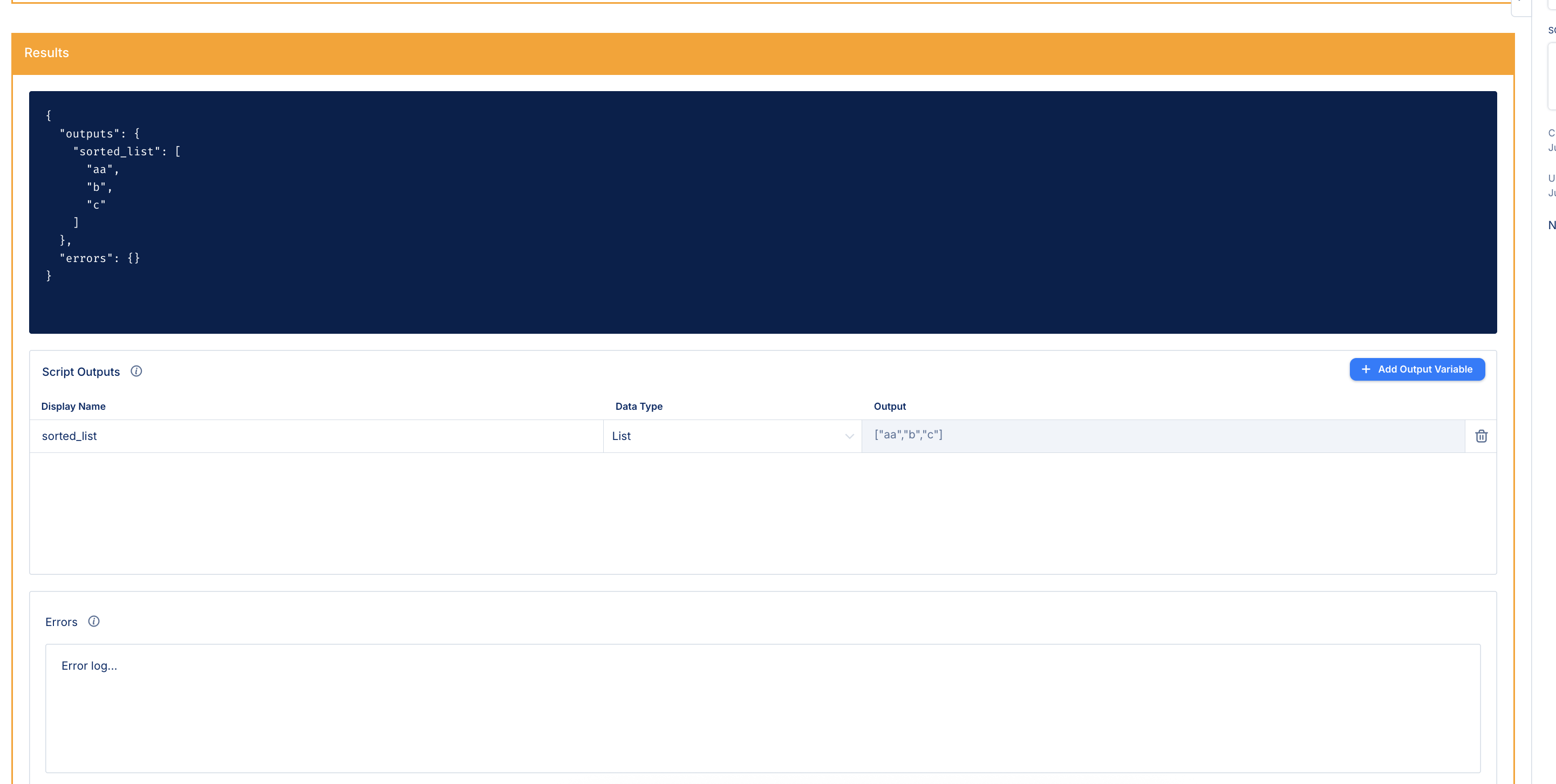 Image Reference 3: Test Results and Output Definition This image shows a successful test where the sorted output ["aa","b","c"] confirms the logic processed the original ["b","aa","c"] inputs correctly. It also shows the corresponding Script Output definition.