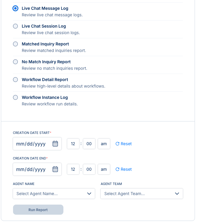 - Creation Start & End Dates - This is a required set of filters to scope the report to bot interactions created within the specified time frame.