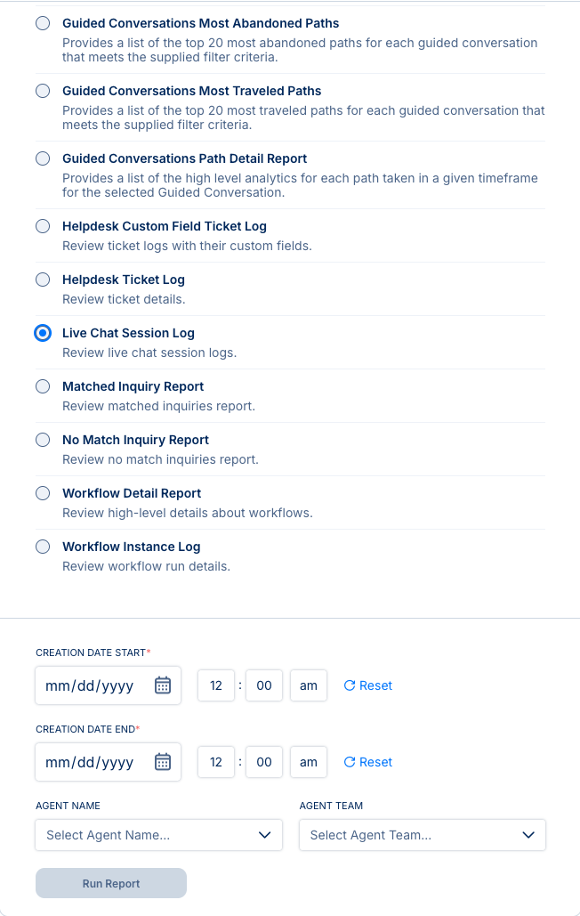Select the Live Chat Session Log report from the list and specify your filter dates to run the report.
